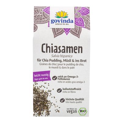 Chia-Samen von Govinda sind ein echtes Superfood für deine Ernährung. Mit nur 15 g (2 Esslöffel) versorgst du deinen Körper mit wertvollen Omega-3-Fettsäuren, Ballaststoffen, Vitaminen und Mineralstoffen. Diese veganen, gentechnikfreien Samen sind ideal für Smoothies, Joghurt oder als Zutat in Müslis. Hol dir die Kraft der Chia-Samen!
