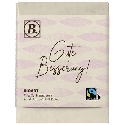 Die BIOART „Gute Besserung“ weiße Schokolade mit Himbeerstücken ist nicht nur eine süße Versuchung, sondern auch ein liebevolles Zeichen der Fürsorge. Diese erlesene Schokolade aus Österreich vereint 96% feinste weiße Schokolade mit zarten Himbeerflocken, die aus fruchtigem Himbeerpüree und Maisstärke walzengetrocknet wurden. Dadurch entsteht ein harmonisches Zusammenspiel von süßem Schokoladengenuss und fruchtiger Frische.