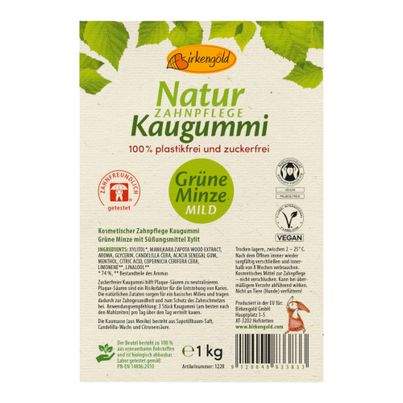 Birkengold Kaugummi in der Geschmacksrichtung Grüne Minze mild bietet dir ein frisches und unbeschwertes Kauvergnügen, das auf natürlichen Zutaten basiert. Die Kaumasse wird aus dem Saft des Sapotillenbaums gewonnen, was nicht nur für einen einzigartigen Geschmack sorgt, sondern auch eine umweltfreundliche Alternative zu herkömmlichem Kaugummi darstellt. Das enthaltene Chandelilla Wachs verleiht dem Kaugummi eine angenehme Textur und sorgt für ein langanhaltendes Kauvergnügen.