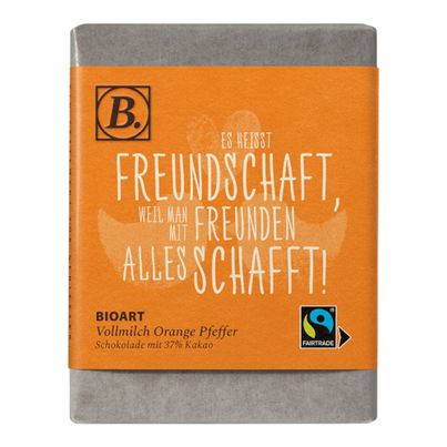 Schoko Spruch Freundschaft 70g von Bioart verbindet köstliche Vollmilchschokolade mit einem Hauch von Orange-Pfeffer. Diese Delikatesse wird aus hochwertiger Heumilch aus der idyllischen Region Trumer Seenland hergestellt und garantiert einen besonderen Genuss ohne Gentechnik. Mit Fairtrade-Standards unterstützt du zudem faire Arbeitsbedingungen. Perfekt für Freundschaftsmomente!
