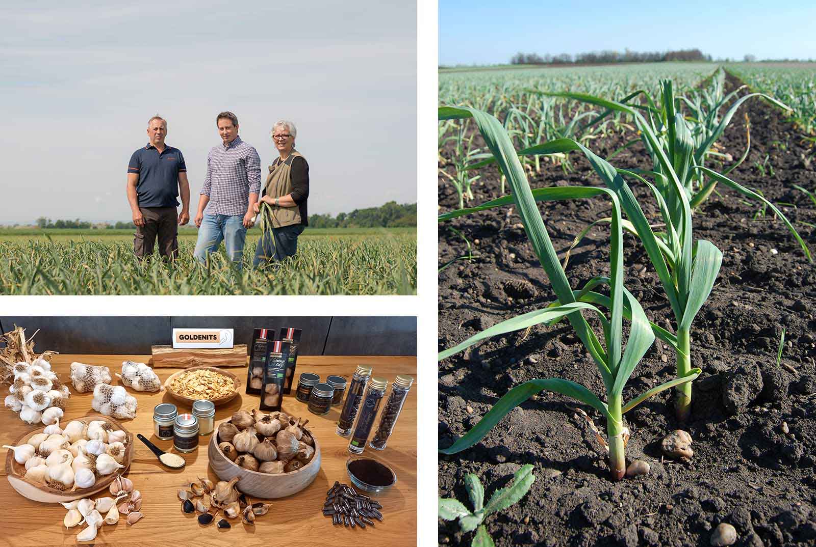 Wir vom Biohof Goldenits haben uns der Veredelung gesunder Lebensmittel aus eigenem Anbau verschrieben. Der Anbau und die Pflege beim Aufwachsen sowie die sorgsame Ernte und Weiterverarbeitung erfolgt dabei gänzlich im sonnigen Burgenland, genauer gesagt in der kleinen Ortschaft Tadten im Seewinkel, direkt am Nationalpark Neusiedlersee. Auf unserem Familienbetrieb wird dabei bereits in 3 Generation Gemüse angebaut, unsere Landwirtschaft haben wir dabei 2007 auf Bio umgestellt. Bereits unser Großvater baute dabei Knoblauch an. Die heimische Produktion konnte allerdings bald mit importiertem Knoblauch aus China, Argentinien oder Ägypten nicht mehr mithalten, der Anbau in Österreich starb letztlich fast aus. Seit 2010 wollen wir diesem Trend entgegenwirken und bauen seither wieder Knoblauch in kontrollierter Bio-Qualität an. Gleichzeitig starteten wir erste Versuche mit der Fermentation unserer Produkte und waren damals Österreichs erste Produzenten von „Schwarzem Knoblauch“ (engl. Black Garlic).