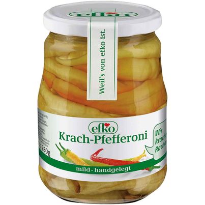 Die efko Krach-Pfefferoni in der 720ml Glasgröße bieten dir ein unvergleichliches Geschmackserlebnis. Diese mild-fruchtigen Pfefferoni sind handverlesen und in einer feinen Marinade eingelegt, die ihre natürliche Frische und Würze perfekt zur Geltung bringt. Als bedeutendster Sauergemüse-Hersteller Österreichs steht efko für höchste Qualität und Tradition. Die Krach-Pfefferoni sind der ideale Snack für zwischendurch und bereichern jede Jause. Sie eignen sich hervorragend als farbenfroher Akzent auf kalten Platten oder Buffets. Kombiniere sie mit Käse, Wurst oder Brot für eine abwechslungsreiche Jause. Ein Tipp: Verwende die Pfefferoni auch als pikante Zutat in Salaten oder als Topping auf Pizzen. Achte darauf, das Glas vor direkter Sonneneinstrahlung zu schützen und nach dem Öffnen im Kühlschrank aufzubewahren, um die Frische zu bewahren. Die Krach-Pfefferoni sind nicht nur ein Genuss für den Gaumen, sondern auch ein optisches Highlight auf jedem Tisch.