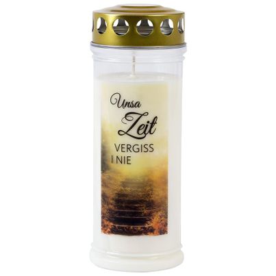 Die mehrfarbige Gestaltung verleiht der Kerze eine ansprechende Optik, die sich harmonisch in jede Umgebung einfügt. Ob auf dem Grab eines lieben Menschen oder als dekorativer Akzent bei Gedenkfeiern – die Grabkerze „Zeit“ setzt ein Zeichen des Gedenkens und der Erinnerung.